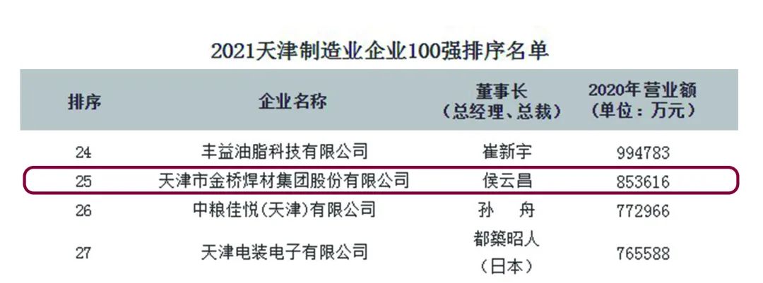 2021年金橋集團再次入選天津企業100強 天津制造業企業100強