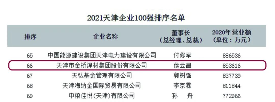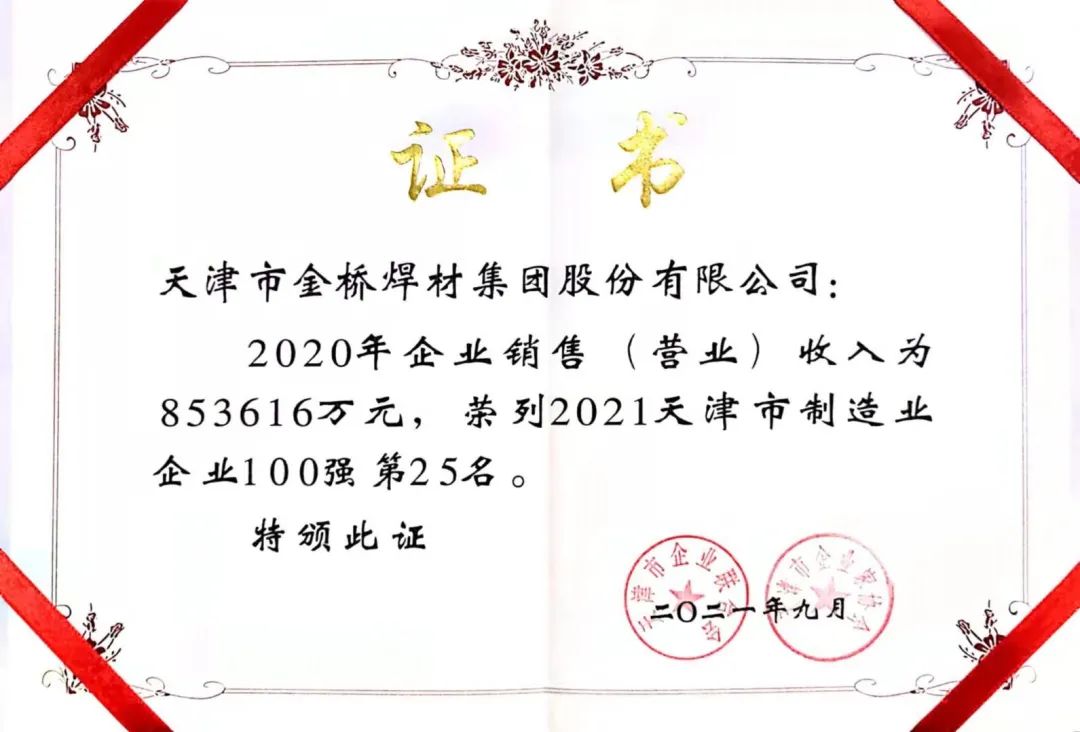 天津百強企業名單已經連續發布十八年,金橋集團也連續十多年入選,這是賦予金橋集團的榮譽,更是對金橋集團的肯定?;仡櫤盍⒆鹣壬鷦撧k企業的發展歷程,金橋集團始終懷揣家國情懷,秉承行業使命,不斷推進企業綠色高質量發展。至今,金橋集團已擁有2家國家級高新技術企業,22家子公司,9個生產基地,是全球最大的綜合性焊材制造企業,是國家工業強基任務中標單位、科技創新示范企業,制造業單項冠軍產品企業和國家級綠色工廠,并榮獲中國機械工業百強、中國工業榜樣企業、中國專利獎—優秀獎等多項榮譽。2020年,金橋集團統籌疫情防控和經濟社會發展,開拓創新,拼搏進取,取得了逆勢增長的成績。