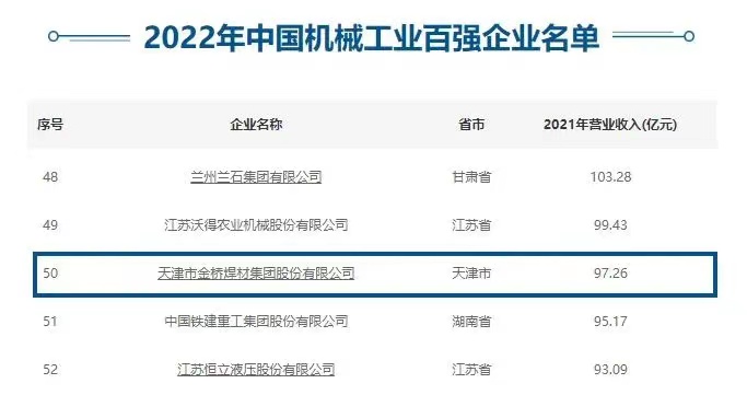 入圍前50! 天津金橋焊材集團(tuán)上榜機(jī)械工程百強(qiáng)名單