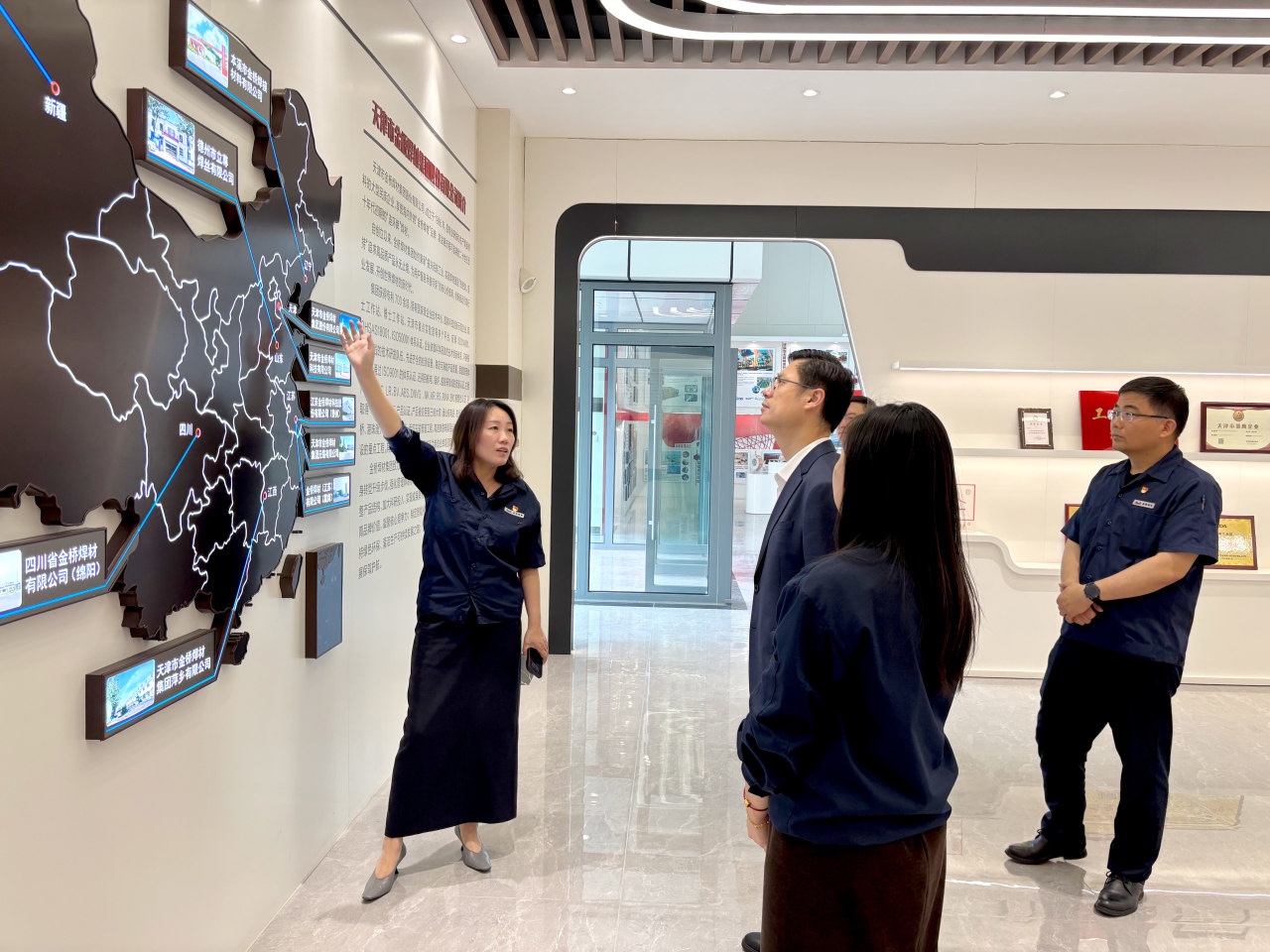 殷俊一行來到金橋焊材集團科技公司,先后參觀了科技公司的生產車間與展廳。在生產車間,先進的生產工藝與高度智能化的制造設備吸引了眾人的目光,工業機器人精準高效地完成各類焊接材料的生產流程,高度自動化的生產線有條不紊地運行著,充分展現了企業在智能制造領域的卓越實力。殷俊副市長詳細詢問了生產流程、產能規模以及技術創新等關鍵環節,對企業在生產環節的高效運作與技術創新給予了充分的肯定。